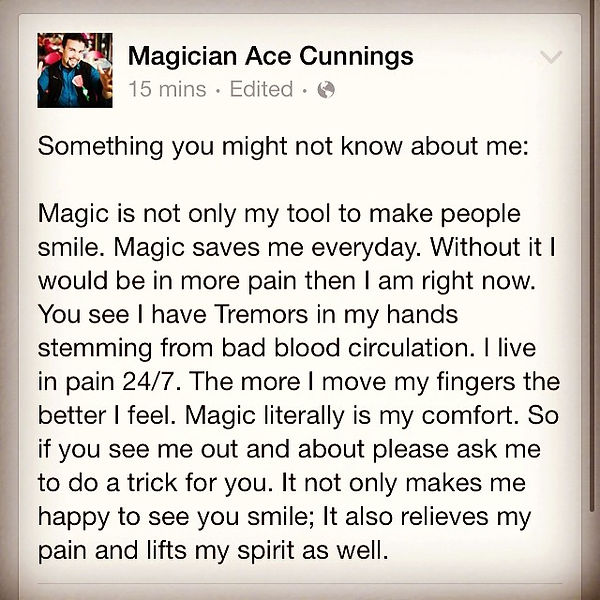 Sleight of hand artist, Illusionist, Entertainer. Ace Has been doing magic for more than 20 years. He has performed at Birthday Parties, City Fairs, Theme Parks, and Corporate Events. He can cater to what the client needs with customized shows that are all your own. With Your choice of Street Magic, Stage Magic, Close-up, or Parlor Acts. Ace's breathtaking brand of magic will entertain guests and have them talking about the event for years to come.
